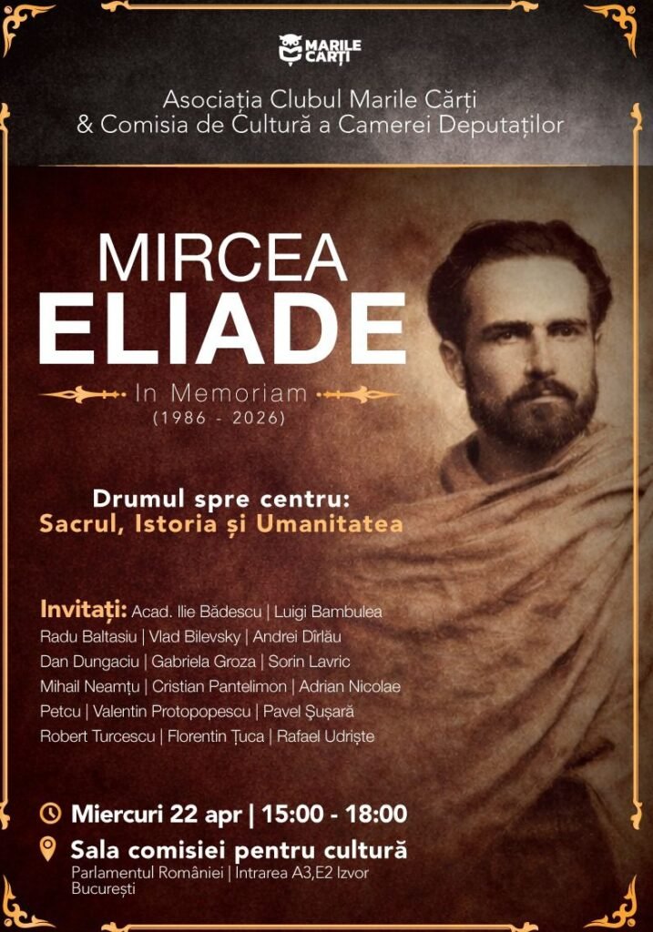 Locul: Palatul Parlamentului, Sala Comisiei pentru Cultură a Camerei Deputaților din Palatul Parlamentului. Intrarea este liberă, însă este necesară rezervarea unui loc gratuit accesând linkul: https://marilecarti.ro/events/eliade-in-memoriam-1986-2026-drumul-spre-centru/