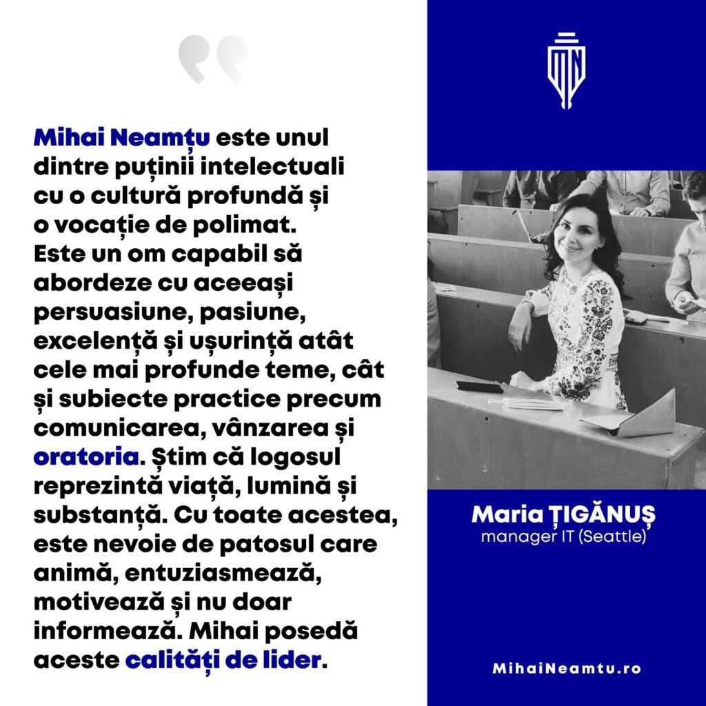 Imaginați-vă cum este să vorbești în fața a 25.000 de persoane. Asta a făcut Mihail Neamțu la nici 35 ani! Expertiza sa este nu doar impresionante, ci inspirațională. În zeci de țări și sute de orașe, cuvintele sale au motivat, au informat și au transformat suflete. Ca antreprenor, om politic și educator, Mihail Neamțu a vorbit în fața unor audiențe diverse, de la studenți până la lideri ai României și ai Uniunii Europene. Discursurile sale combină eleganța intelectuală, erudiția istorică și claritatea argumentației cu retorica poeziei și emoția metaforelor.