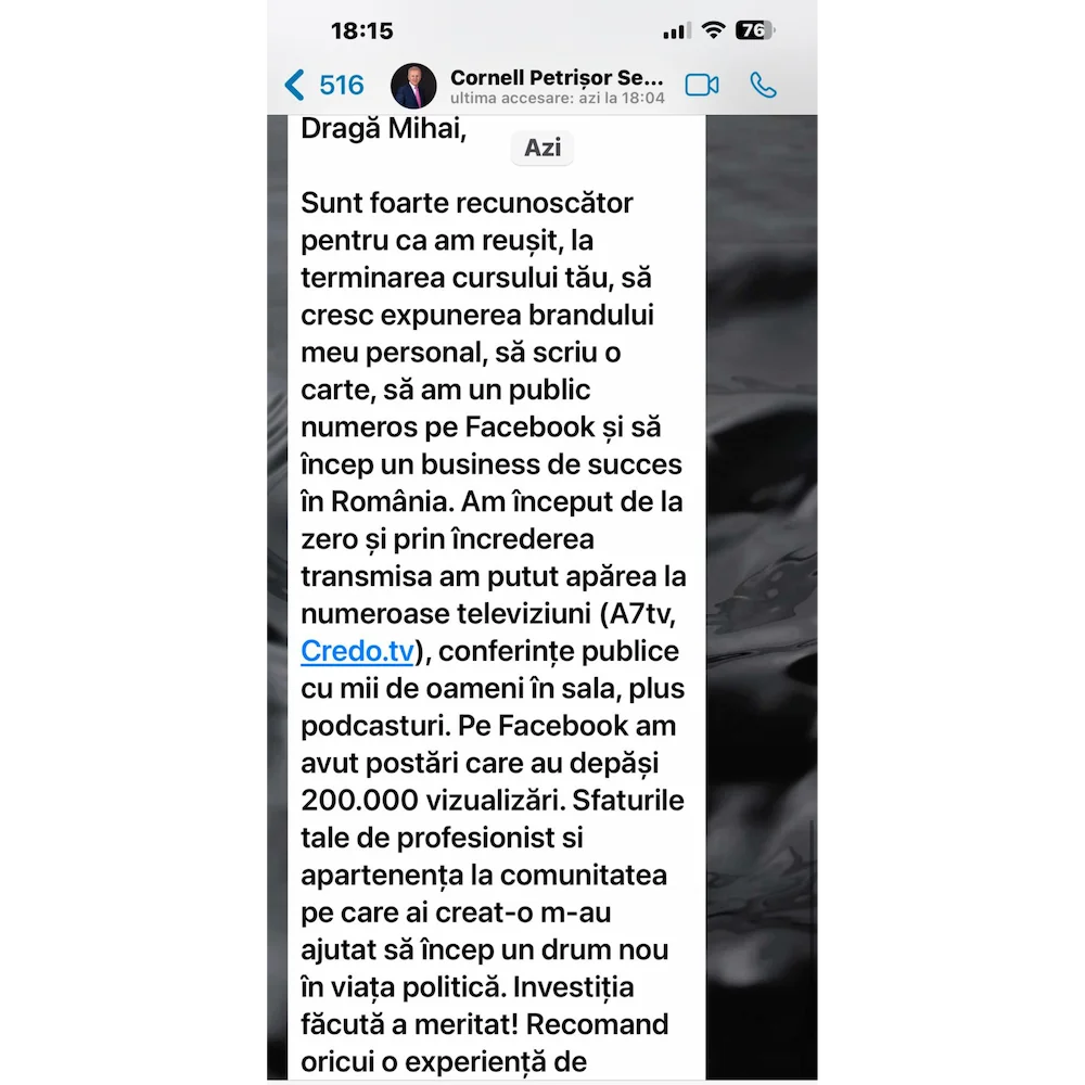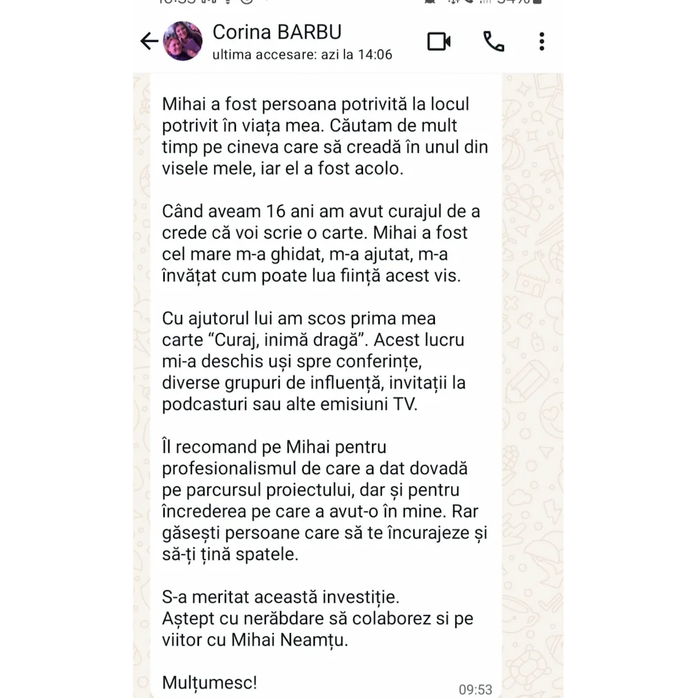 Am lucrat cu antreprenori, manageri, dascăli, oameni de cultură, lideri politici și decidenți dornici să comunice claritate și viziune într-un mesaj cu impact asupra a milioane de oameni.